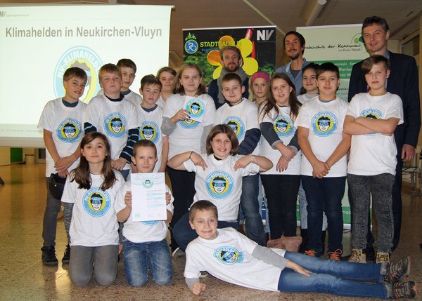 Im Anschluss gab es für die 5d der Gesamtschule gleich nochmal Applaus: Die Stadt präsentierte ihr neues Klimaschutzlogo, das von nun an den erfolgreichen Weg der nachhaltigen Ausrichtung Neukirchen-Vluyns visuell unterstützen wird. Ergänzt wird es durch die „Klimahelden“. Die (klima-) freundlich dreinblickenden Helden sind sozusagen Gesicht und Auszeichnung zugleich. Projekte rund um die Themen Klima- und Naturschutz, erneuerbare Energien und verantwortungsvoller Umgang mit Ressourcen können mit einem „Klimahelden“ ausgezeichnet werden. Der Erfolg der 5d ist das erste Ausrufezeichen in der Stadt, das einen solchen Helden erhielt – in Form eines Aufklebers auf der Klassentür. Wer als nächster „Klimaheld“ ausgezeichnet wird, steht noch nicht fest. Kreative private Projekte zum Energiesparen, aber auch größer angelegte Initiativen können „Klimahelden“ werden. Es bleibt spannend – und das nachhaltig.